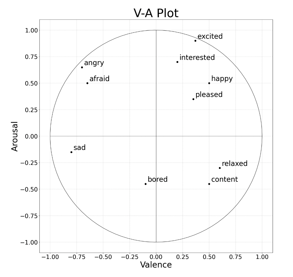 2D model employs a Valence-Arousal (V-A) plot to identify emotions. This model uses a graph with Arousal (y axis) and Valence (x axis) to plot emotions and provide a visual representation.